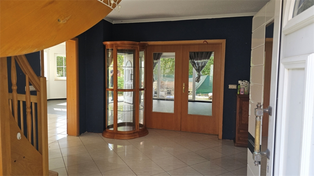 Im Erdgeschoss befindet sich ein repräsentativer heller Flur, mit Zugang zum ca. 45m² großen Wohnzimmer mit Kamin und Essbereich im Erker und angrenzender sehr großen Wohnküche.